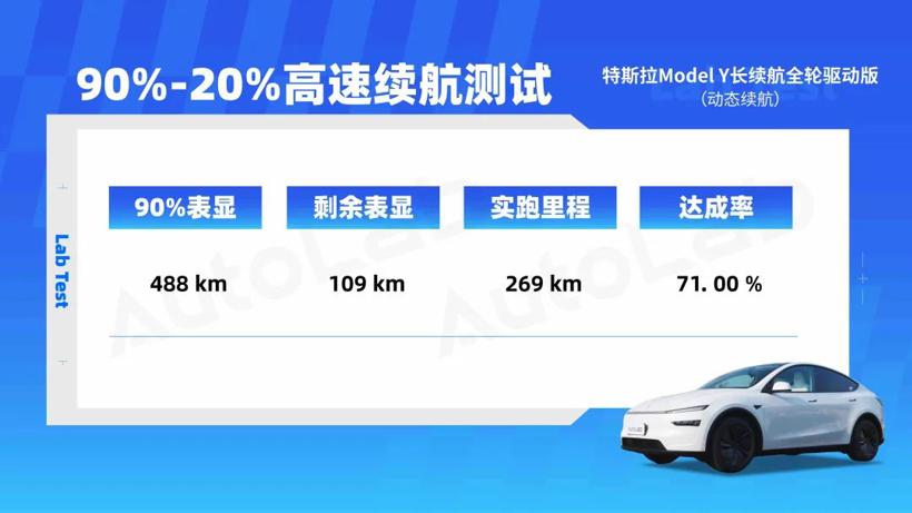 在这种严苛的工况下,以往参加《LAB测试》的很多车的续航达成率都在60%-65%之间徘徊,特斯拉焕新Y超70%的续航达成率,表现突出。