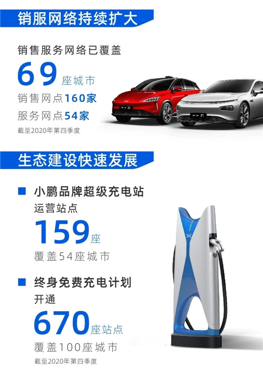 同时,去年北京车展期间,小鹏官方正式宣布开启首任车主免费超充额度。截至2020年第四季度,小鹏汽车共计开通670个终身免费站点,覆盖了100座城市。根据规划,2021年将有超过200个城市会提供小鹏终身免费充电服务,并在高速、机场、商场等多个场景来拓展充电体验。
