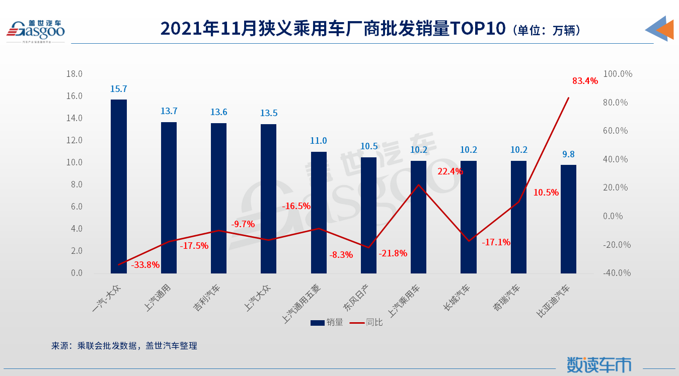 就11月狭义乘用车厂商批发销量来说,排名前十的车企与10月相比再次出现变化。其中,最明显的变化有以下三点:其一,吉利汽车取代上汽通用五菱进入前三甲;其二,长安“落榜”,奇瑞再入围;其三,东风日产排名前移,由10月的末位上升至11月的第六位。