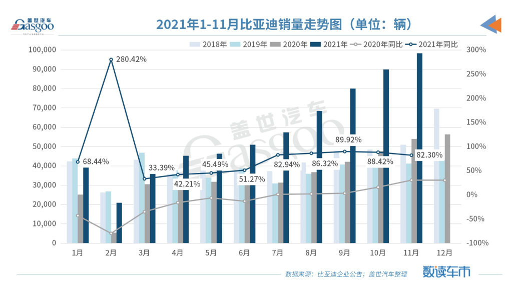 比亚迪11月销量为9.8万辆,再度入围狭义乘用车厂商批发销量排名前十的行列。今年,在芯片短缺的大环境下,比亚迪却迎着国内新能源汽车持续增长的风口迅速起飞,销量与股价齐增长。数据显示,今年1-11月,比亚迪累计销量已达64万辆,同比增长72.94%。其中,新能源汽车今年累计销量达到了51万辆,占比亚迪总销量的80%。这意味着比亚迪将成为向新能源领域转型最为彻底,同时也是最为迅速的自主品牌乘用车企业。