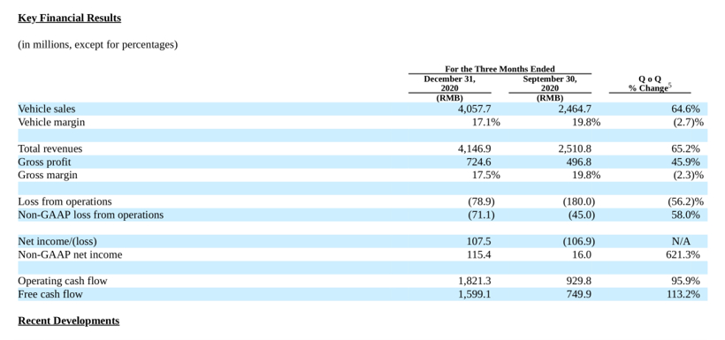 除了节节攀升的销量数据,令市场更为之振奋的是,2020年第四季度理想汽车净利润为1.075亿元人民币,2020年第三季度为净亏损1.069亿元人民币, 理想首次实现季度净利润为正。这意味着,理想汽车成为首家实现季度盈利的造车新势力。