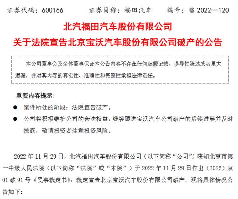 11月29日,我们从福田汽车官方获悉,北京宝沃汽车股份有限公司被北京市第一中级人民法院裁定宣告破产。