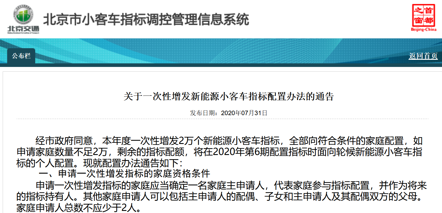 7月31日,北京市小客车指标调控管理信息系统网站发布了《关于一次性增发新能源小客车指标配置办法的通告》和《申报指南》。8月1日起,北京将面向“无车家庭”一次性增发2万个新能源小客车指标。