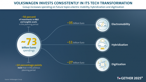 当地时间11月13日,大众集团宣布在未来五年内,对电动化、混合动力总成和数字化方面的投资提升至约730亿欧元。这使针对未来技术的资本支出和研发投入,由原本占集团总投资额(约1500亿欧元)的40%,提升至50%。