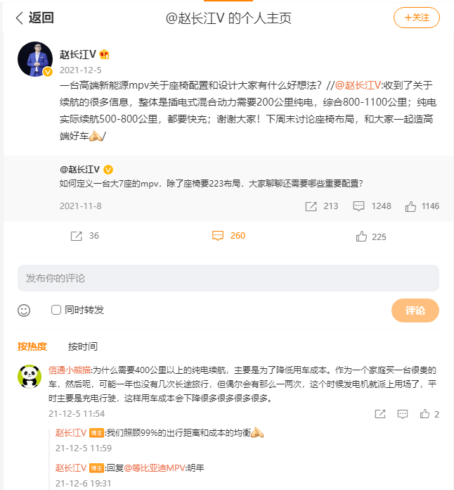 说好的高端品牌是硬派的越野车,而作为比亚迪汽车高端品牌筹备办公室主任的赵长江在其微博发送的都是MPV车型!并向用户征求意见。这很不符合常令人匪夷所思,直到有关的知情人士透露,赵长江将负责腾势汽车,首款车型定价预计在40-50万之间。
