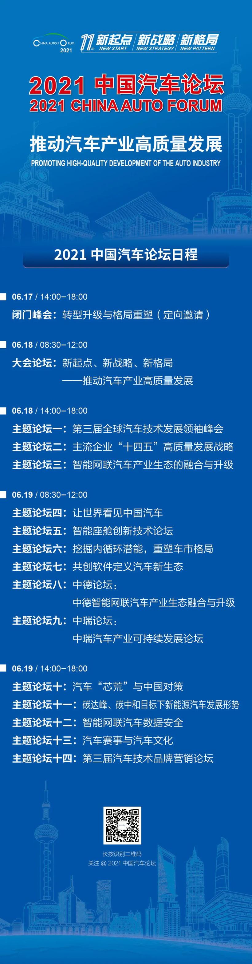 2021年6月17-19日,第11届中国汽车论坛将在上海嘉定举办。站在新五年起点上,本届论坛以“新起点 新战略 新格局——推动汽车产业高质量发展”为主题,设置“1场闭门峰会+1个大会论坛+2个中外论坛+12个主题论坛”,全面集聚政府主管领导、全球汽车企业领袖、汽车行业精英,共商汽车强国大计,落实国家提出的“碳达峰、碳中和”战略目标要求,助力构建“双循环”新发展格局。