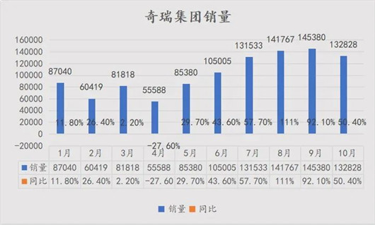 奇瑞控股集团也发布了10月销量快报,奇瑞集团销售汽车132,828辆,同比增长50.4%,连续第5个月单月销量突破10万辆。1-10月份,奇瑞集团累计销售汽车1026,758辆,同比增长38.8%,首次年内累计销量突破百万辆。