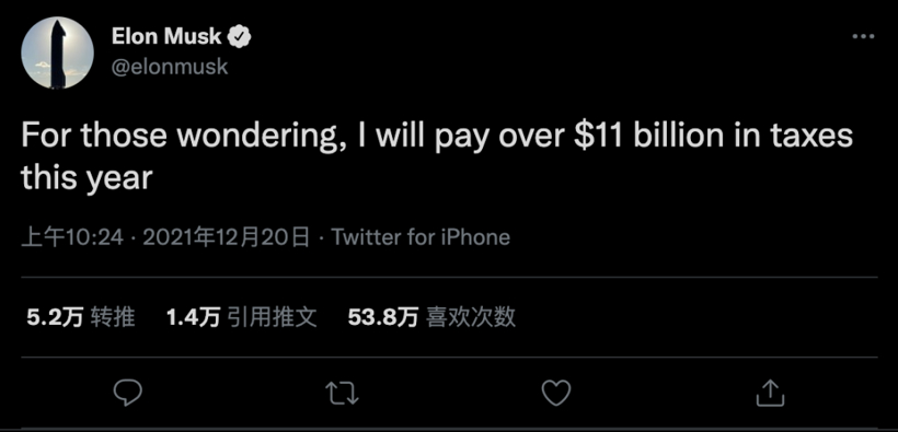 就在薇娅被罚的同一天,特斯拉CEO埃隆·马斯克(Elon Musk)发布推特称,他今年将缴纳税款超过110亿美元(约合人民币700.865亿元),如果马斯克兑现承诺,这或是美国国税局(IRS)迄今为止收到的最大一笔税款。