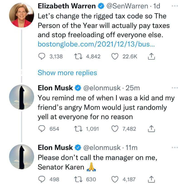 前不久,马斯克被美国《时代》杂志评为“年度人物”,该杂志给予马斯克极高的评价。然而美国民主党参议员伊丽莎白·沃伦却在社交媒体上嘲讽称,“让我们改变被操纵的税法,这样年度人物就会真正缴税,并停止从其他人身上捞钱。”