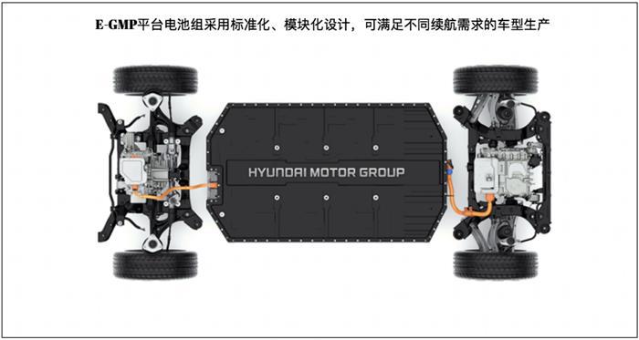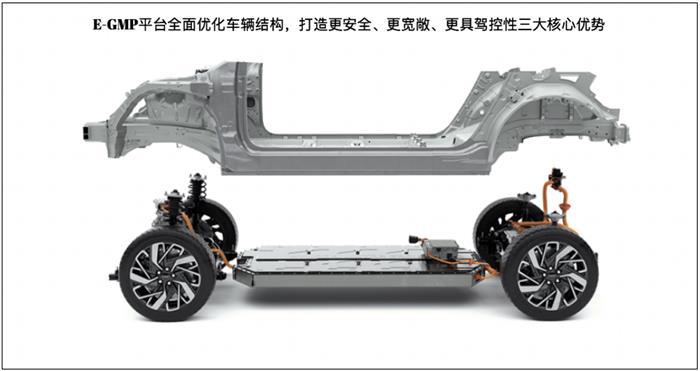 也正由于结构的精简,随着诸如引擎、变速箱等占据了较大空间的总成消失,在应用E-GMP平台时,就可在原有安装引擎的位置搭载了轻量化的驱动电机,并将电池安装在车身中央下端。