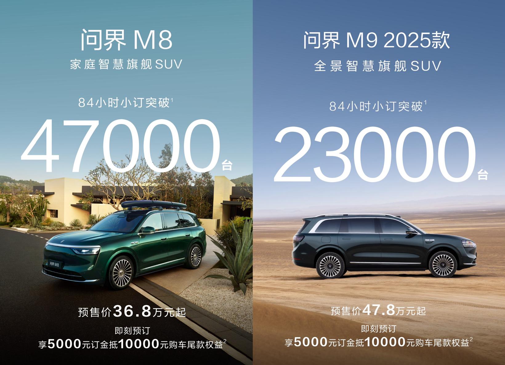 3月10日消息,鸿蒙智行官方于近日宣布,旗下的问界M8车型和2025款问界M9车型预售84小时小订分别突破4.7万台和2.3万台。