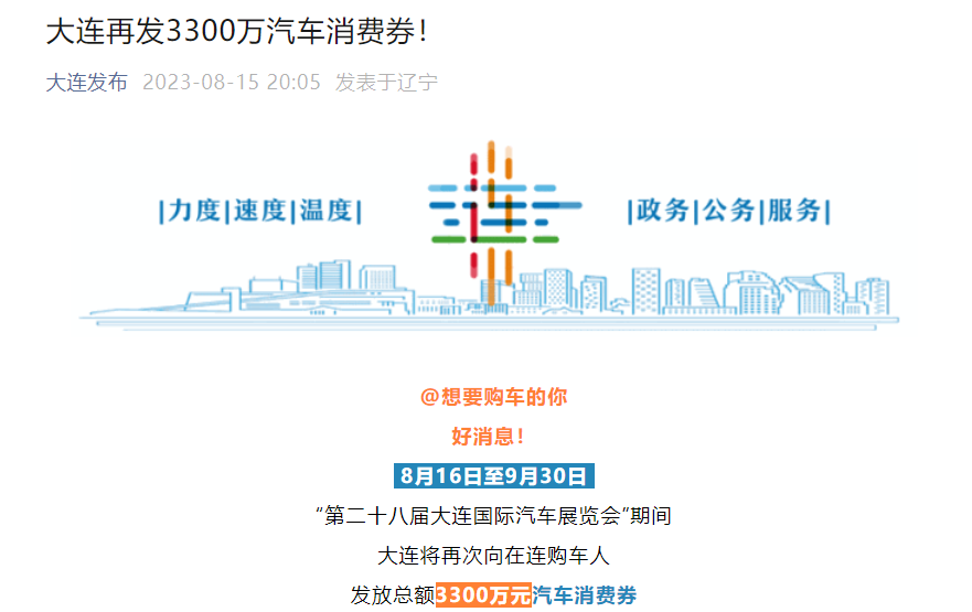 据大连发布公众号显示,大连市将在2023年8月16日至9月30日开展的“第二十八届大连国际汽车展览会”期间,再次向在连购车人发放总额3300万元的汽车消费券。
