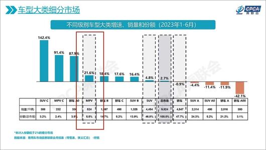 事实上,这些一窝蜂涌入MPV市场的品牌,没有一个不向往着高端市场,推出的新车也一个比一个豪华。2023年上半年MPV市场累计销量为52.4万辆,同比增长21.6%,远高于乘用车整体零售销量的增幅,似乎给这些加入MPV大局的品牌吃了一记定心丸。
