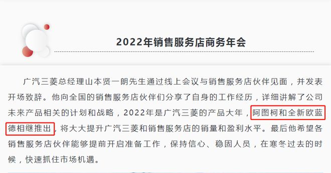 近日,网易汽车从“广汽三菱2022年销售服务店商务年会”获悉,在2022年广汽三菱将迎来阿图柯(参数丨图片)和全新欧蓝德两款全新车型的上市。其中阿图柯是一款纯电紧凑型SUV,已于2021广州车展中开启预售,预售价格区间为21万元-24万元,硬核版预售尝鲜价为23.38万元。全新一代欧蓝德已于2021年在海外正式亮相,作为第四代车型,新车采用全新设计语言,外观更具辨识性,结合此前获得信息来看,新车将于2021年10月投产。