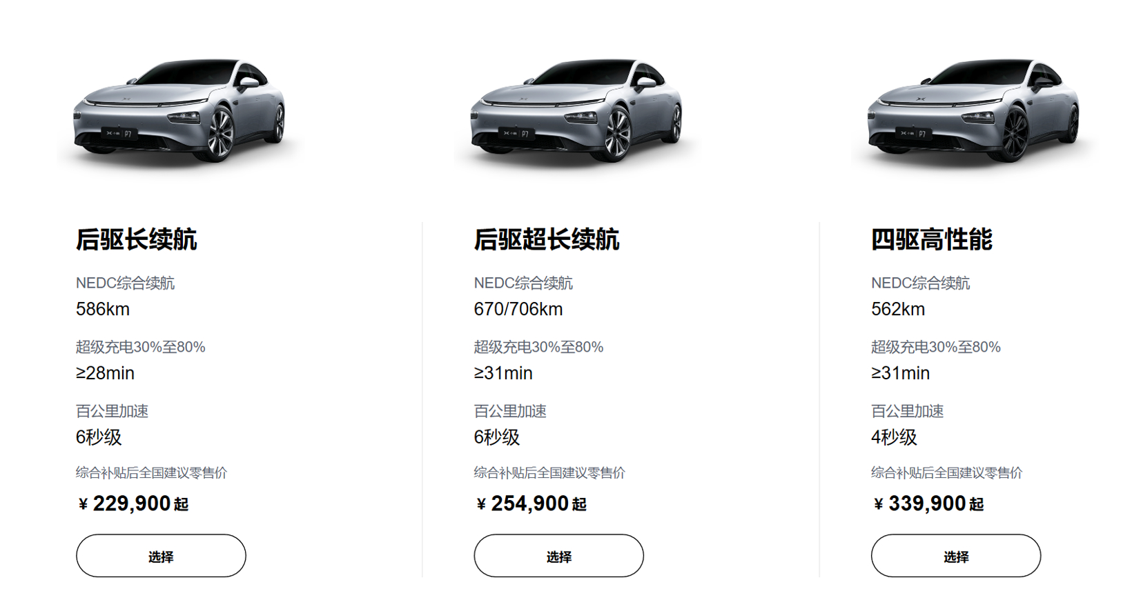 小鹏汽车官网显示,小鹏P7主要分为后驱和四驱两种驱动形式,后驱车型又分为长续航版和超长续航版,其中超长续航版NEDC综合续航可达到706km,相比之下,四驱高性能版NEDC综合续航较低,售价也最高,但其智能配置较为丰富。