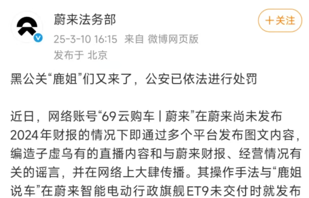 蔚来法务部在通报中指出,网络账号“69云购车 | 蔚来”在蔚来尚未发布2024年财报的情况下,即通过多个平台发布图文内容,编造直播内容和与蔚来财报、经营情况有关的谣言,并在网络上大肆传播。这种行为与“鹿姐说车”在蔚来智能电动行政旗舰ET9未交付时就发布事先准备的谣言和长篇抹黑文案的手法如出一辙,涉嫌严重违法。公安机关已依法对“69云购车 | 蔚来”账号的运营主体万存汽车销售(上海)有限公司相关人员仪某、王某进行处罚。