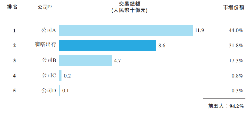 中国顺风车市场高度集中,根据弗若斯特沙利文报告,按2023年顺风车搭乘次数计算,前三大市场参与者的市场份额为96.1%。嘀嗒出行名列中国顺风车市场第二,搭乘次数为1.3亿次,市场份额为31.0% ;按交易总额计算,嘀嗒出行的顺风车交易总额为86亿,市场份额达31.8%,