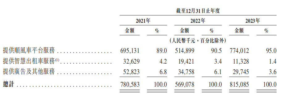 招股书显示,2021年至2023年,嘀嗒出行的营业收入分别为人民币7.81亿、5.69亿和8.15亿元。其中,顺风车服务费是嘀嗒出行最为依赖的收入来源,占比高达九成。