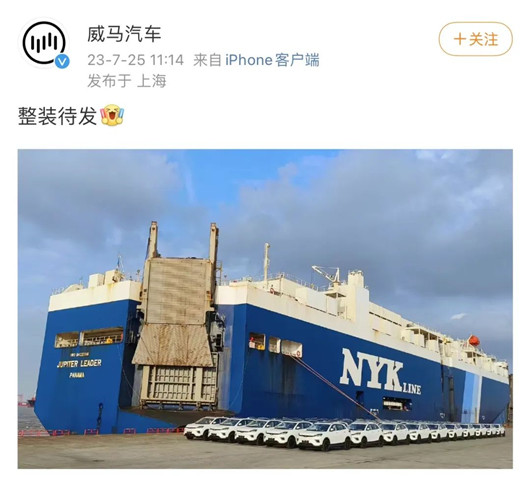 7月25日,威马官方微博发布了一条内容为“整装待发”的消息,并配上一批新车在货轮前的照片。尽管官方对于此次车辆出口的目的地、数量都未作具体透露,但威马创始人沈晖依然及时转发,并附以“出发,一起去看海!”的文案。
