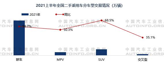 从二手乘用车交易情况看,由于上年同期疫情导致的低基数,2021年上半年各车型交易量同比均有明显增长。其中SUV以68.5%的增幅居首,表现较为突出,在乘用车市场的交易占比提升至13.6%。轿车仍是二手车市场绝对的交易主力,占乘用车76.4%,较上年同期提高0.2个百分点。