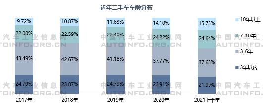 从二手车车龄分布看,二手车使用年限在3-6年的交易量最多,但2020年来占比呈明显收窄趋势;相应的,7年以上车龄交易占比逐步增加,其中,10年以上增速更为突出。
