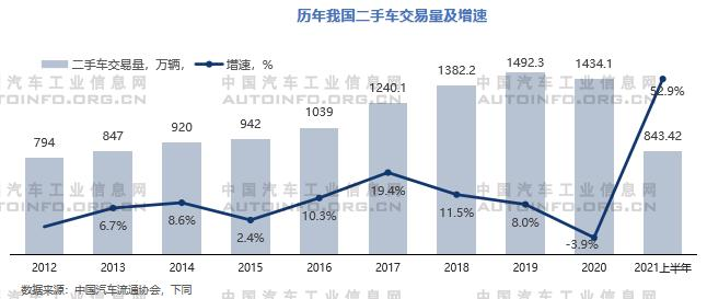 2021年上半年,我国二手车交易量达到843.42万辆,同比增长52.9%。有行业专家预测,今年全年二手车交易量将突破1600万辆,增长率达到15%左右。