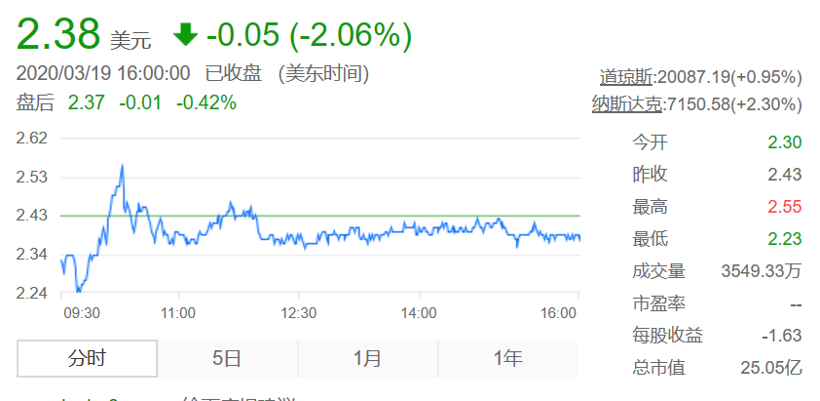 财报发布后,蔚来在盘前交易中股价大跌,盘中一度下跌达19.3%,报2.34美元。截至3月19日收盘,蔚来股价报收2.38美元,跌幅2.06%,总市值25.05亿美元。考虑到美股第五次熔断,该股价的参考意义或将打折。据悉,在过去的2019年,其股价最低曾触底1.19美元,最高也只达到6.03美元。
